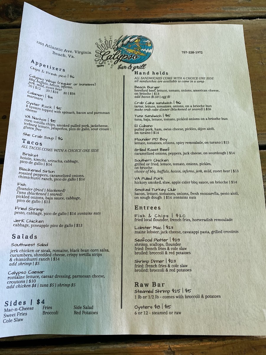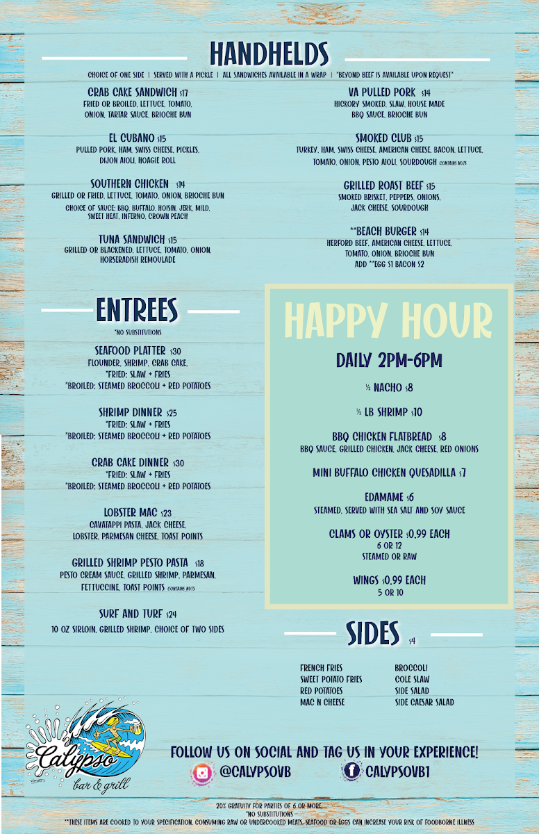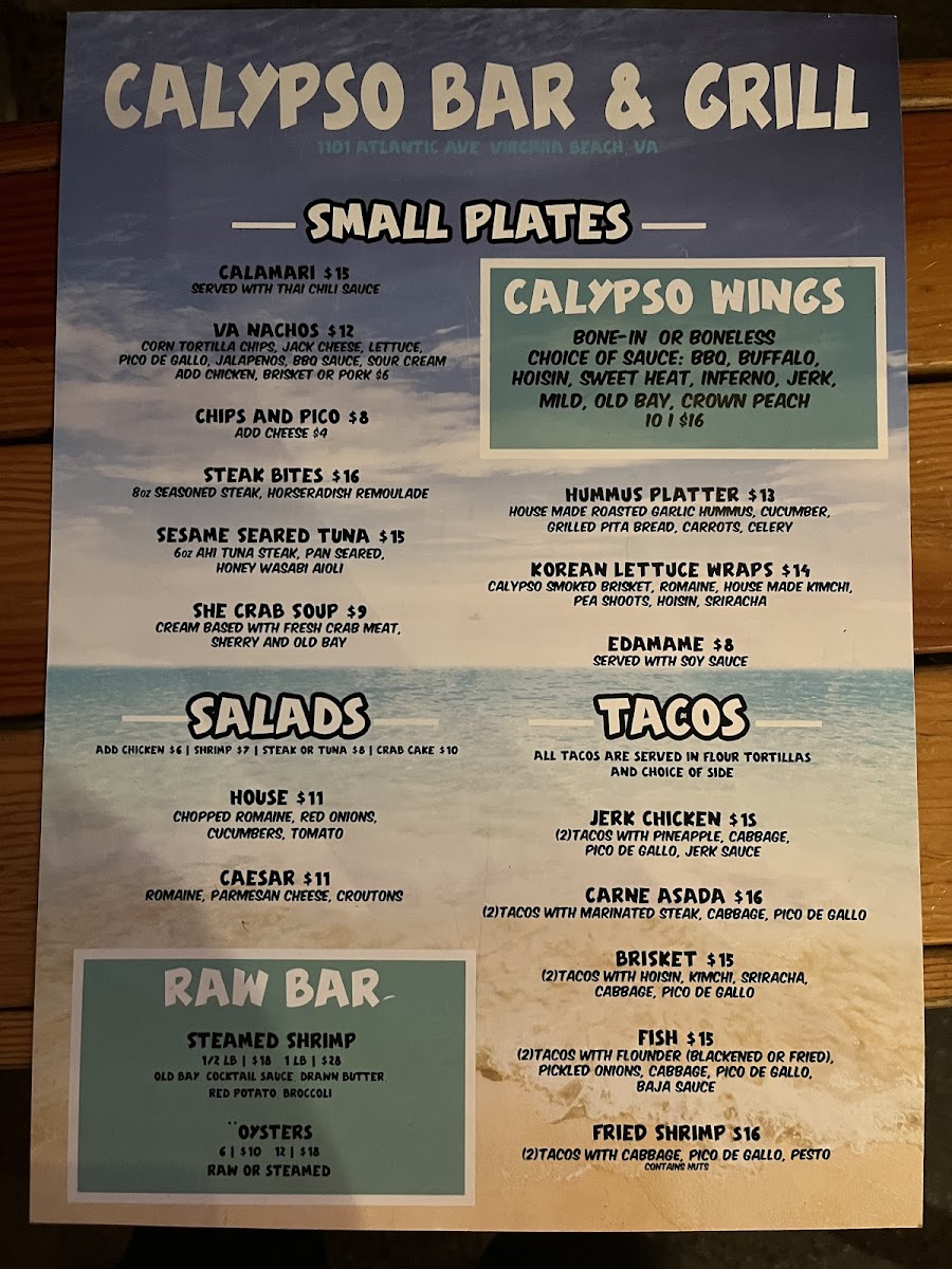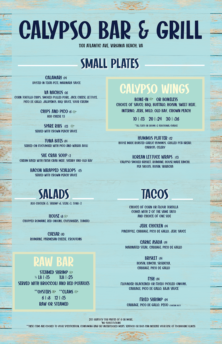 Introducing the menu of Calypso Bar & Grill, an inviting eatery located at 1101 Atlantic Ave in Virginia Beach. This vibrant spot is perfect for families and friends seeking a delightful dining experience by the beach. The menu offers a tantalizing selection of dishes that cater to all tastes.